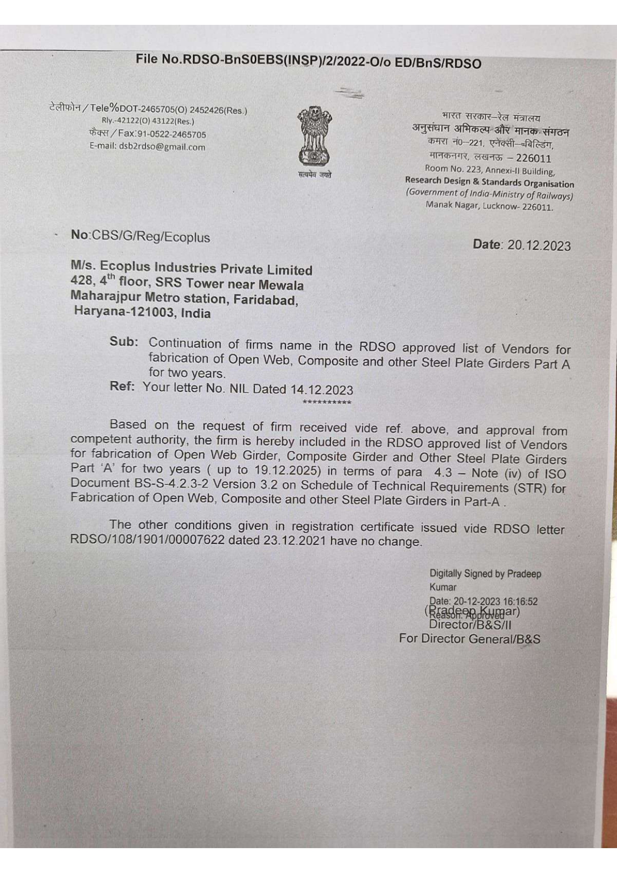 RDSO Certificate B