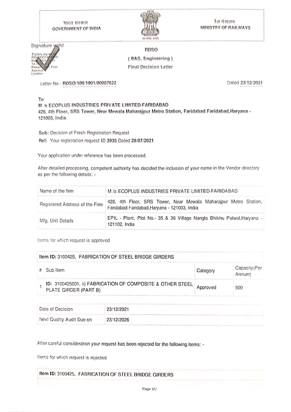 RDSO Certificate A